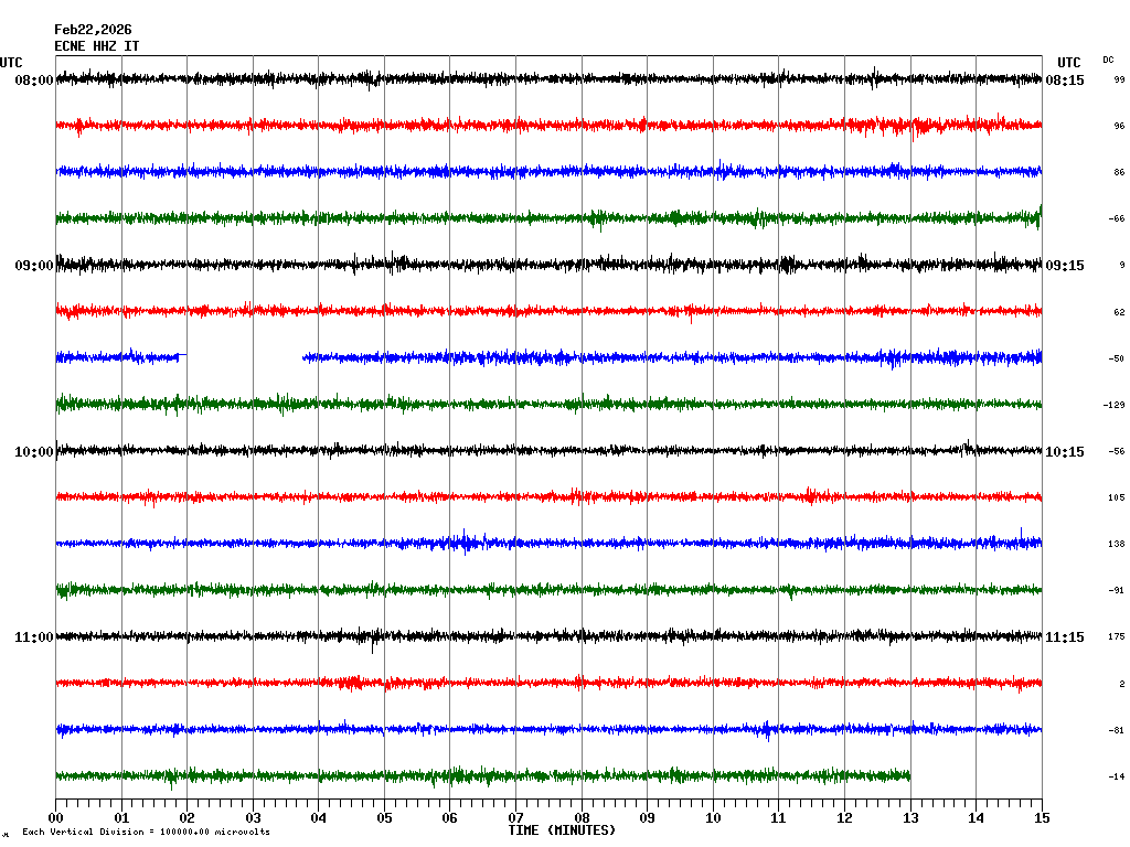 In questa pagina sono visualizzate le tracce registrate nelle ultime 24 ore ad alcune stazioni sismiche della rete permanente INGV-OE ubicate nell'area vulcanica etnea e delle Isole Eolie. In ogni schermata sono rappresentate 4 ore di registrazione. Le schermate corrispondenti alle diverse fasce orarie possono essere selezionate dalla tabella riportata in alto. Ogni riga rappresenta 15 minuti di registrazione e ogni minuto è separato dalle linee verticali. Gli orari sono espressi in UTC. Pertanto per ottenere l'ora locale occorre aggiungere 1 ora quando è in vigore l'ora solare o aggiungere 2 ore quando è in vigore l'ora legale.