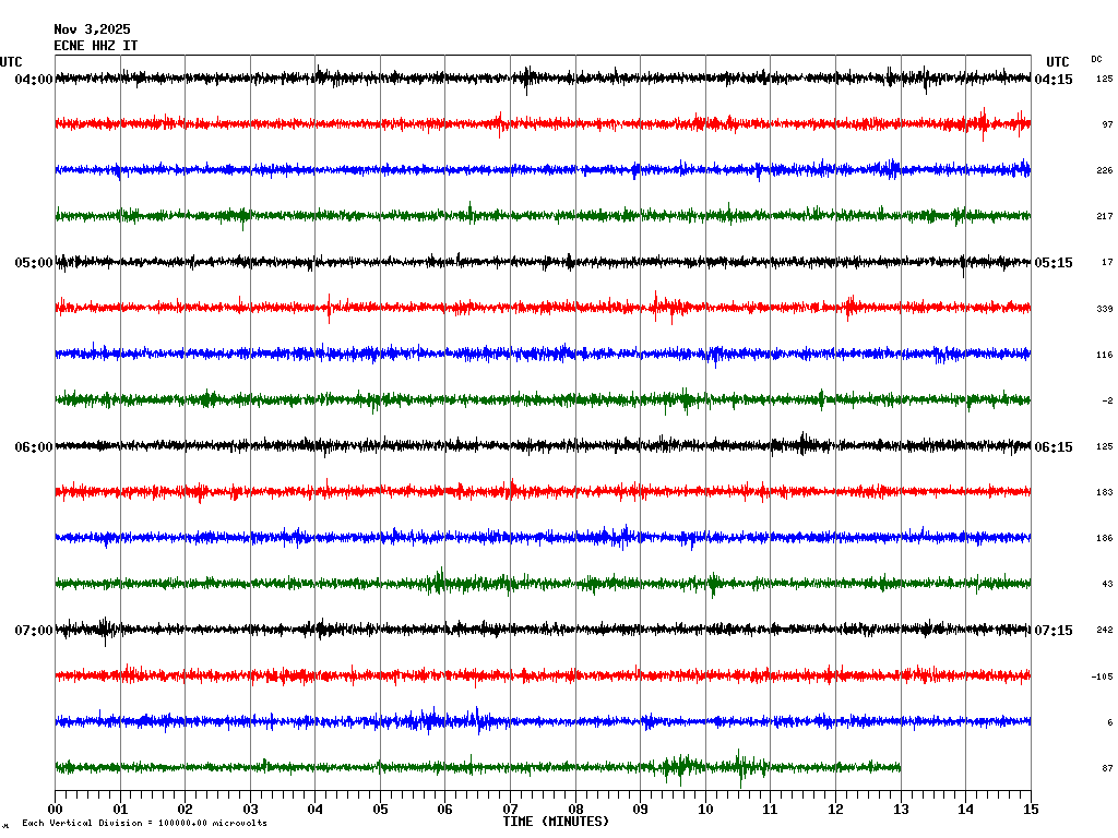 In questa pagina sono visualizzate le tracce registrate nelle ultime 24 ore ad alcune stazioni sismiche della rete permanente INGV-OE ubicate nell'area vulcanica etnea e delle Isole Eolie. In ogni schermata sono rappresentate 4 ore di registrazione. Le schermate corrispondenti alle diverse fasce orarie possono essere selezionate dalla tabella riportata in alto. Ogni riga rappresenta 15 minuti di registrazione e ogni minuto è separato dalle linee verticali. Gli orari sono espressi in UTC. Pertanto per ottenere l'ora locale occorre aggiungere 1 ora quando è in vigore l'ora solare o aggiungere 2 ore quando è in vigore l'ora legale.